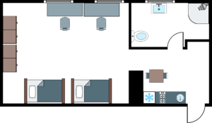 - Majas on kahetoalised korterid, kus igas korteris on kas kaks ühekohalist või kaks kahekohalist tuba. Korteri elanikud jagavad omavahel kööki ning WC/duširuumi.