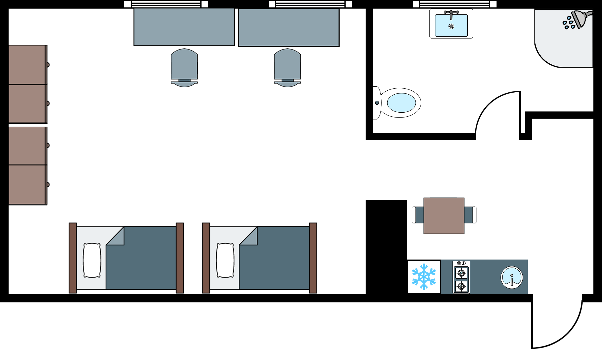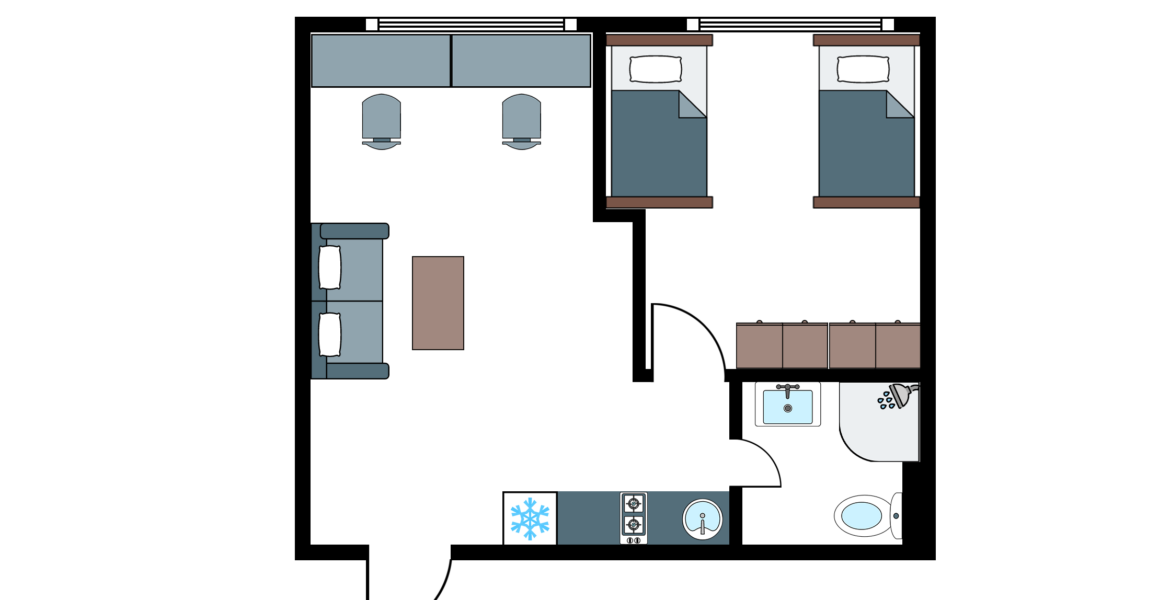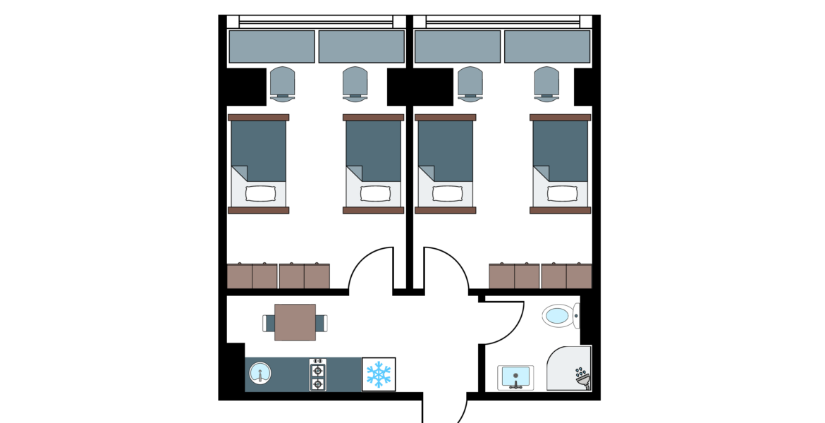 - Lisaks asuvad igal korrusel ka ühetoalised korterid, mis on sisustatud kahele inimesele ning sisaldavad eraldi kööki ja WC/duširuumi.