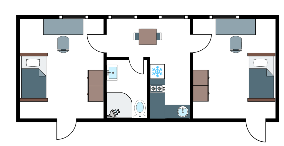 - Majas on kahetoalised korterid, kus igas korteris on kas kaks ühekohalist või kaks kahekohalist tuba. Korteri elanikud jagavad omavahel kööki ning WC/duširuumi.