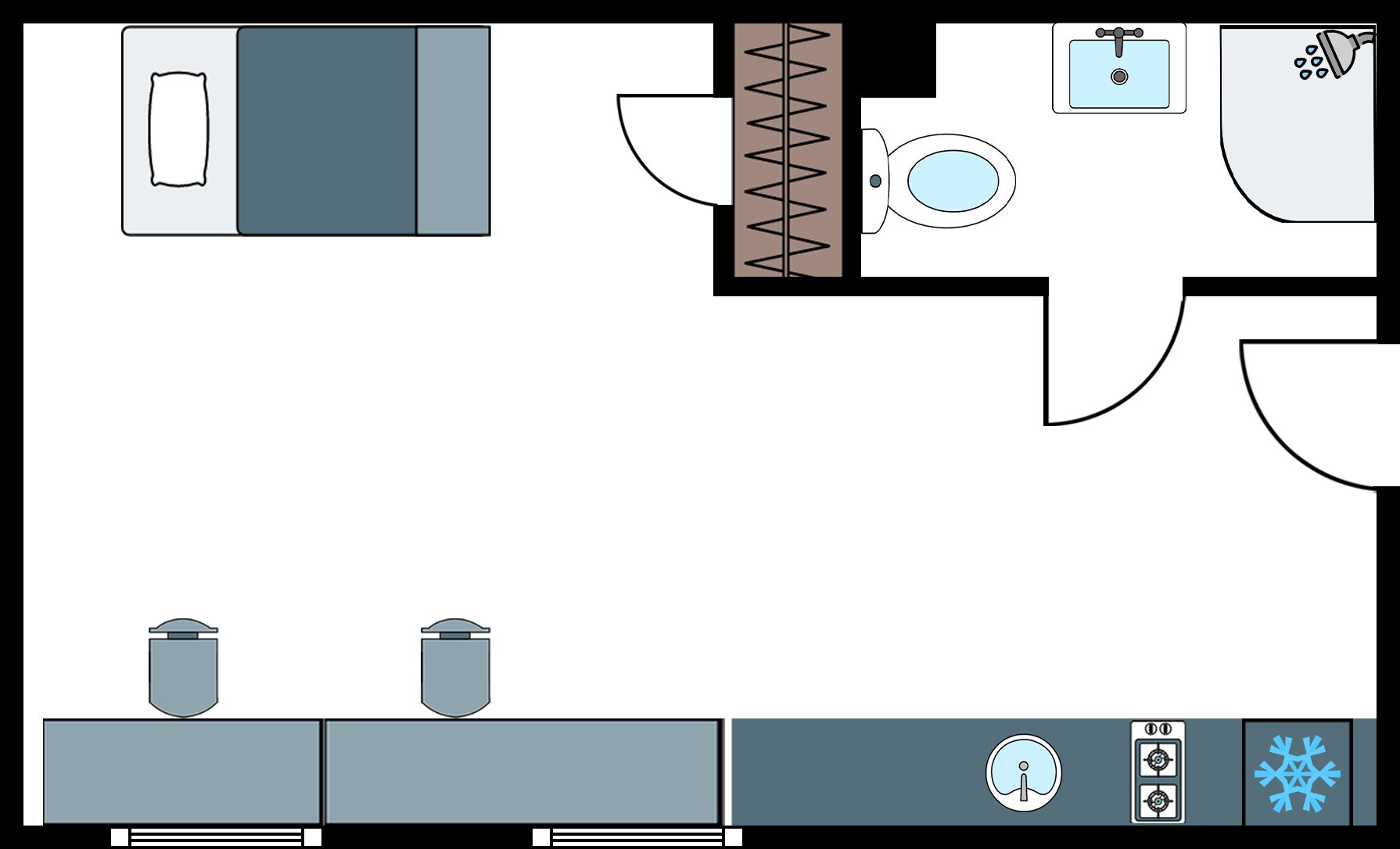 - Stuudiokorterid on privaatsed elamispinnad, kus tudengil on oma vannituba, WC ja väike kööginurk söögi valmistamiseks.