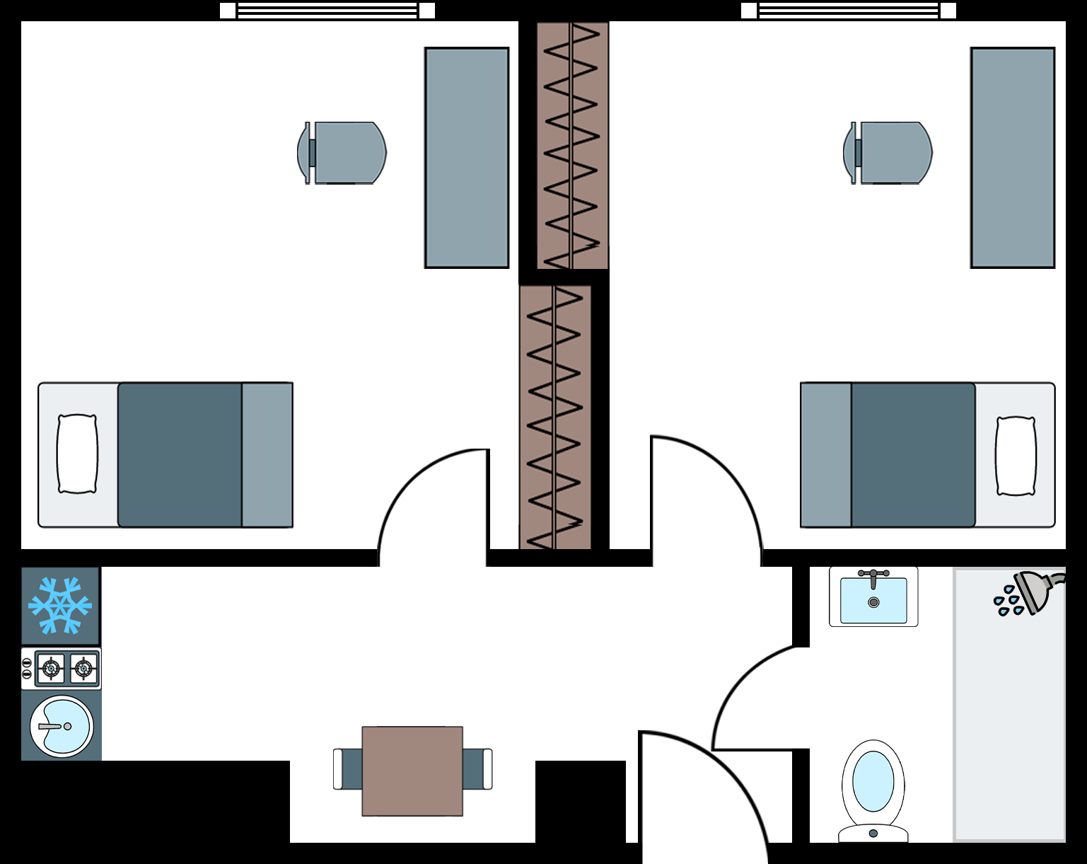 Enamikes korterites on kaks tuba– üks ühekohaline ja üks kahekohaline tuba. Korterites on duširuum ja WC, mis on mõeldud mõlema toa üürnikele. Esikus on külmkapp. Korterites eraldi kööki ei ole, kuid koridoris asub ühisköök, mida kasutavad mitme korteri elanikud.