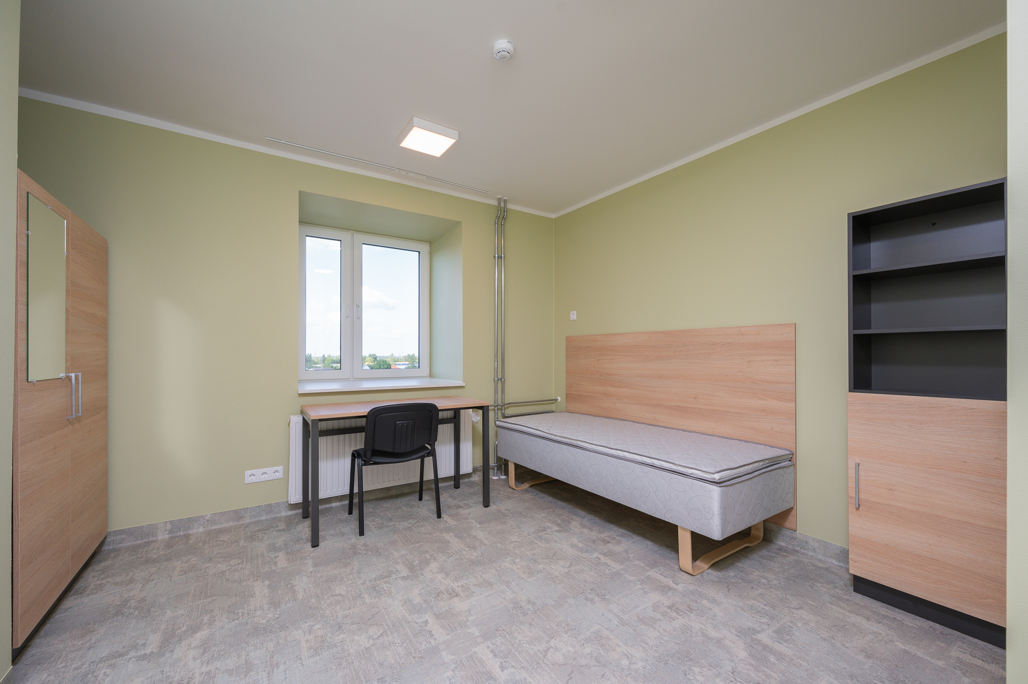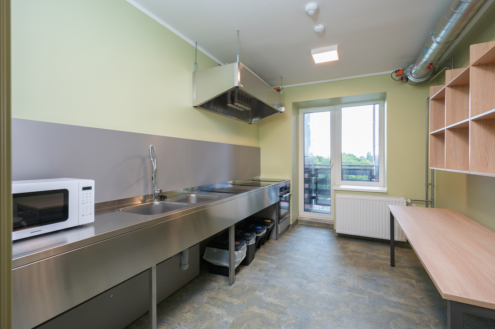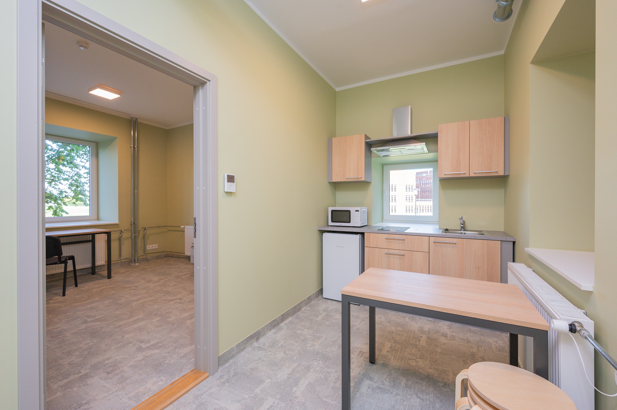 - Ülejäänud hoones on korterites üks 1-kohaline ja üks 2-kohaline tuba, korteris on WC ja duširuum ning külmkapp korteri elanikele. Nende korterite elanike kasutuses on koridoris asuvad ühisköögid, ühte kööki kasutavad nelja korteri elanikud. Köökides on olemas induktsioonpliidid, ahi ja mikrolaineahi. Igal toal on ühisköögis oma tähistatud riiul, kus saab hoiustada köögitarbeid.