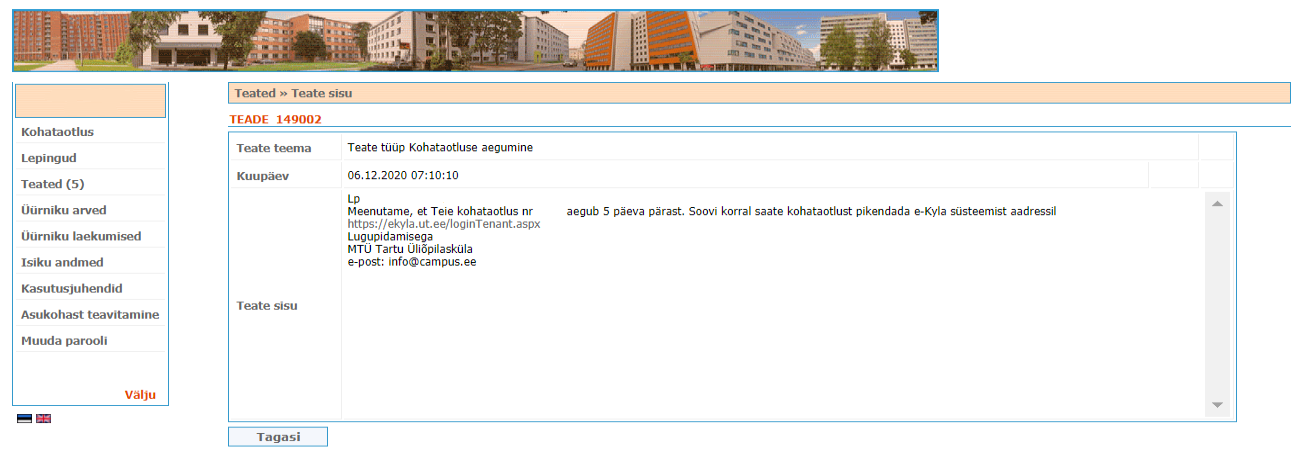 Üliõpilasküla poolt saadetud teateid on võimalik näha E-kyla keskkonnast. Teadete lugemiseks kliki “Teated” menüüle.