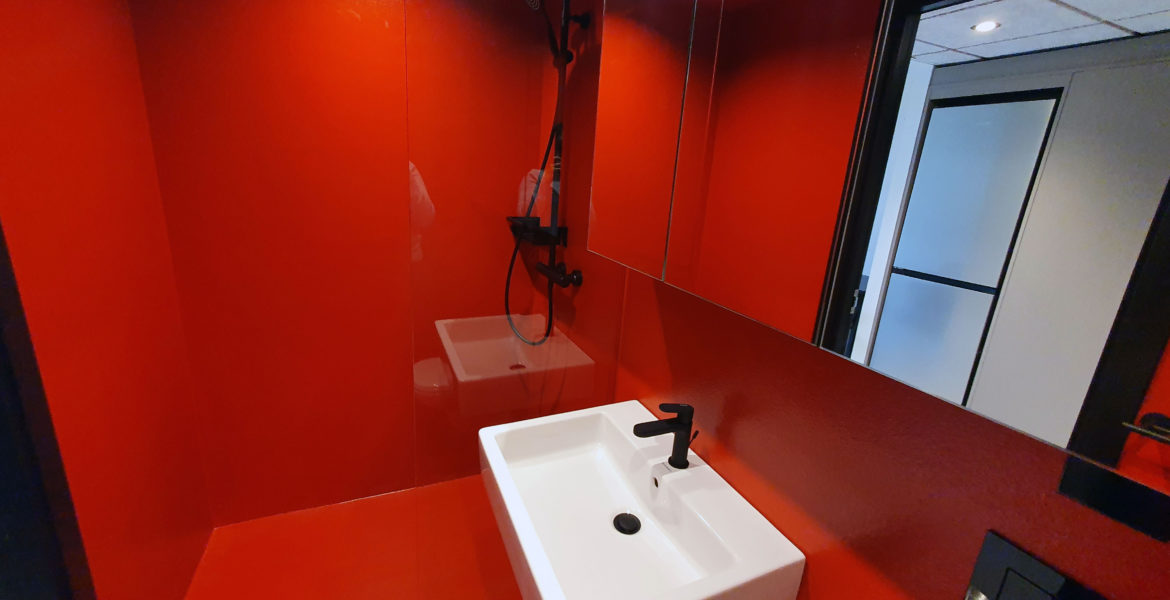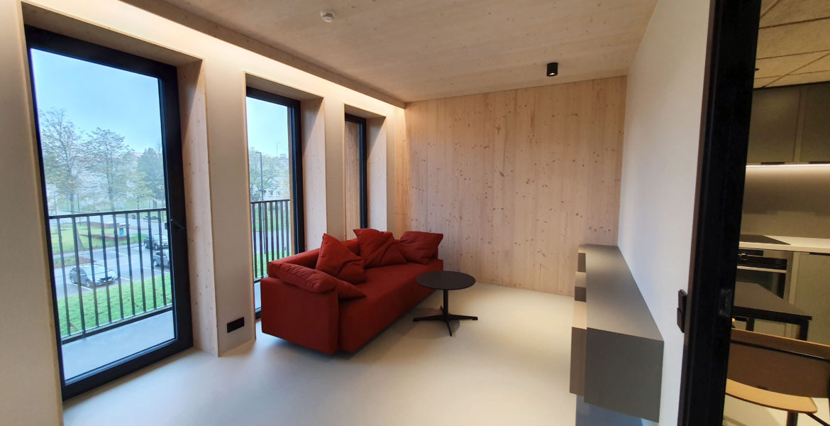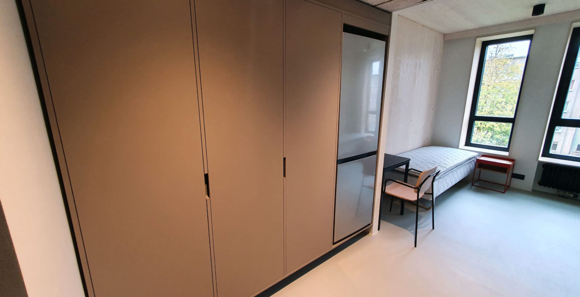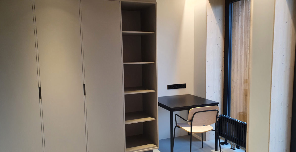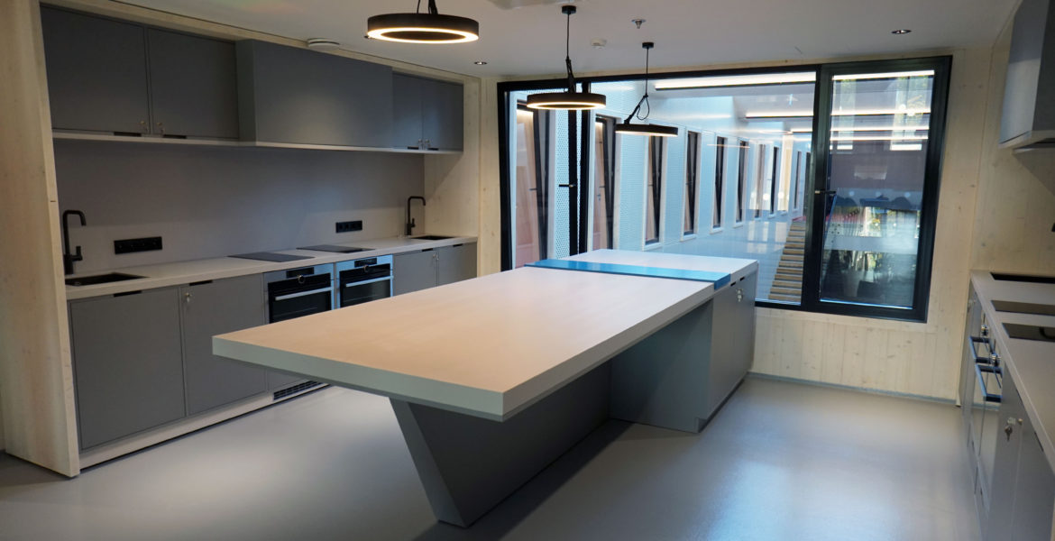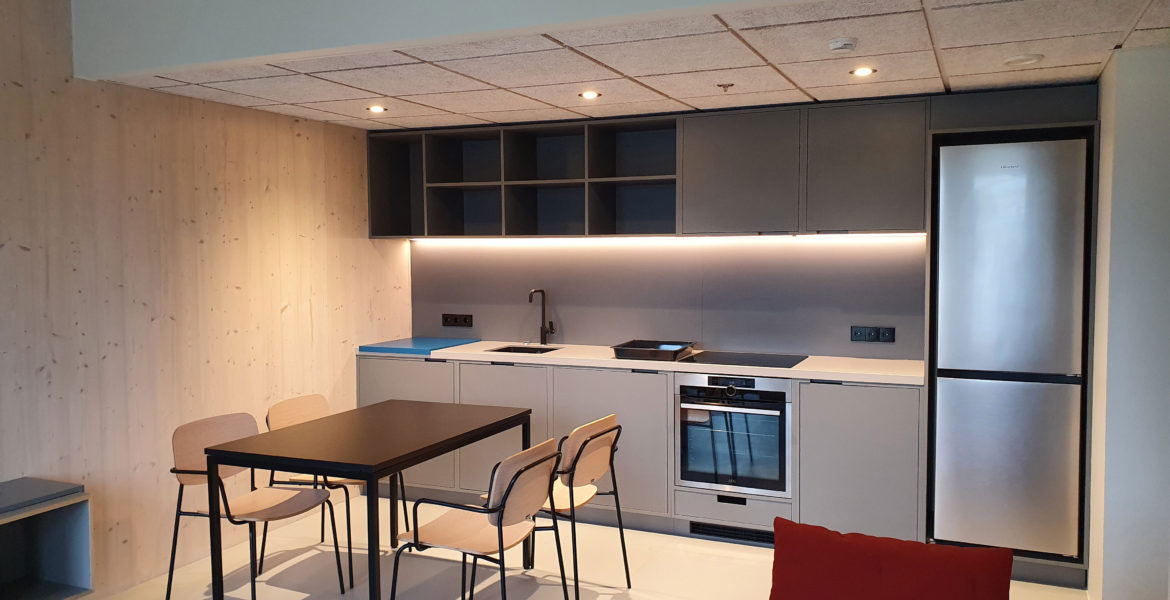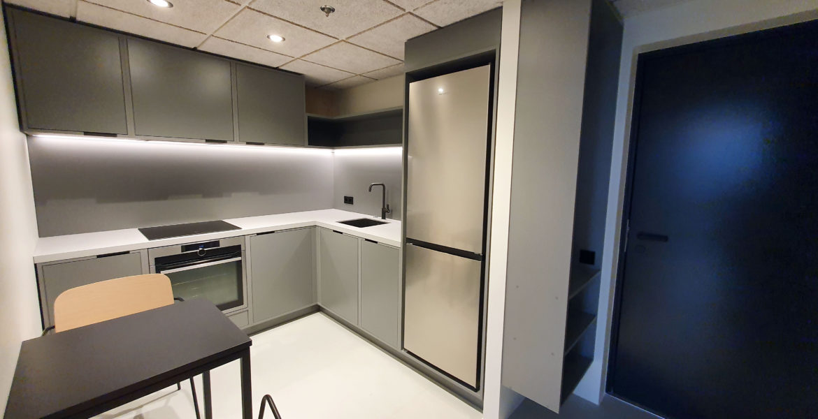 Twin rooms have a shared kitchen on every floor with induction stoves and ovens. The apartments have private kitchens.