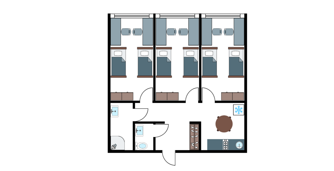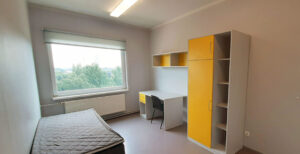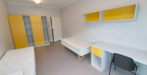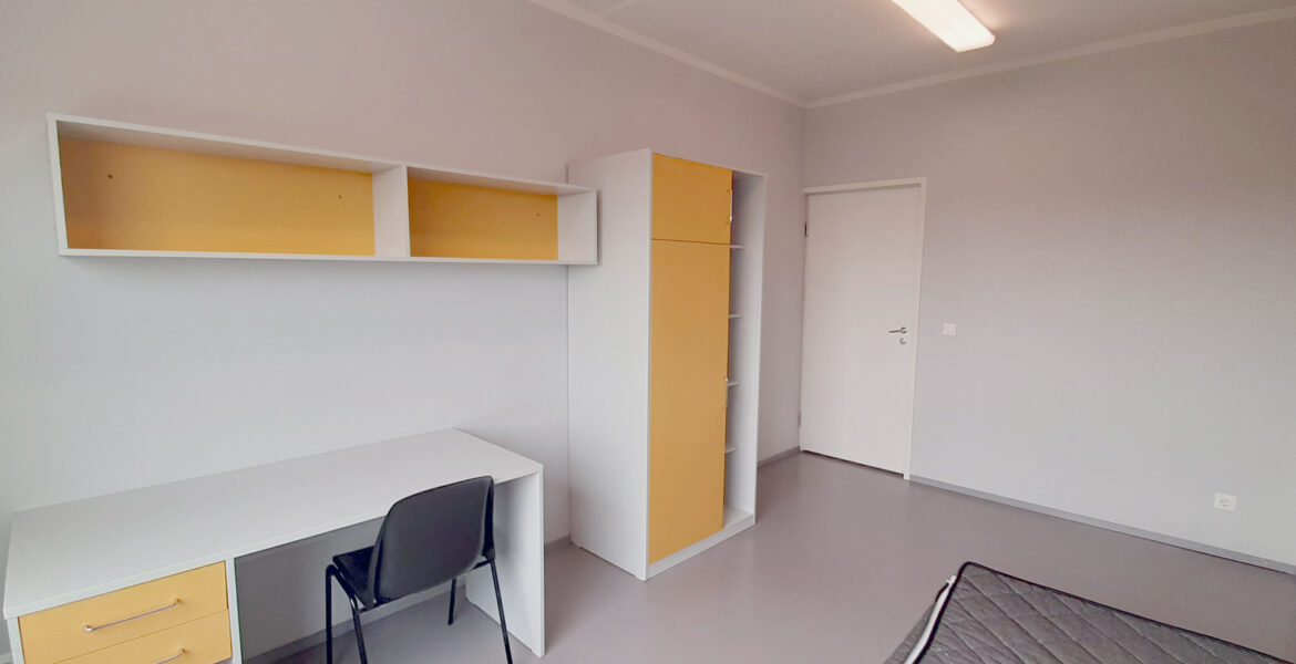 The residence consists of three-room apartments that include both single and double rooms. The residents of each apartment share a kitchen equipped with a stove and a refrigerator. The toilet and shower room are located separately, which makes shared living more convenient.