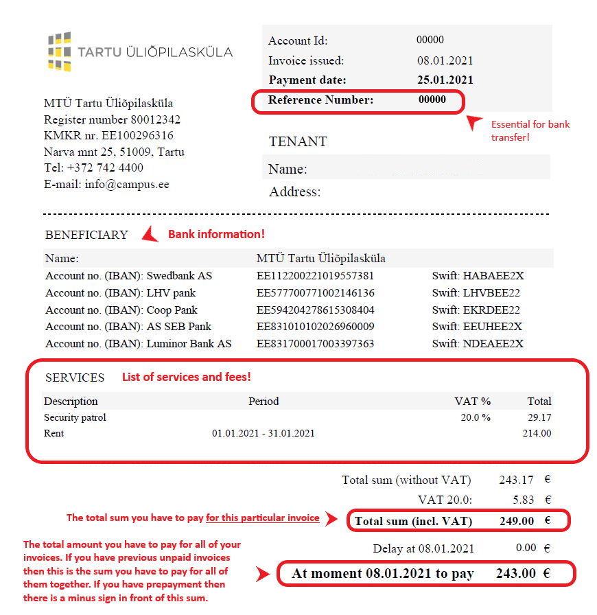 When making a bank transfer, write the number of the invoice on the details line and write the reference number on the reference number line. If the reference number is missing, the amount paid will be transferred back to the bank account of the payer. If the reference number is incorrect, the amount paid will not reach the right contract.